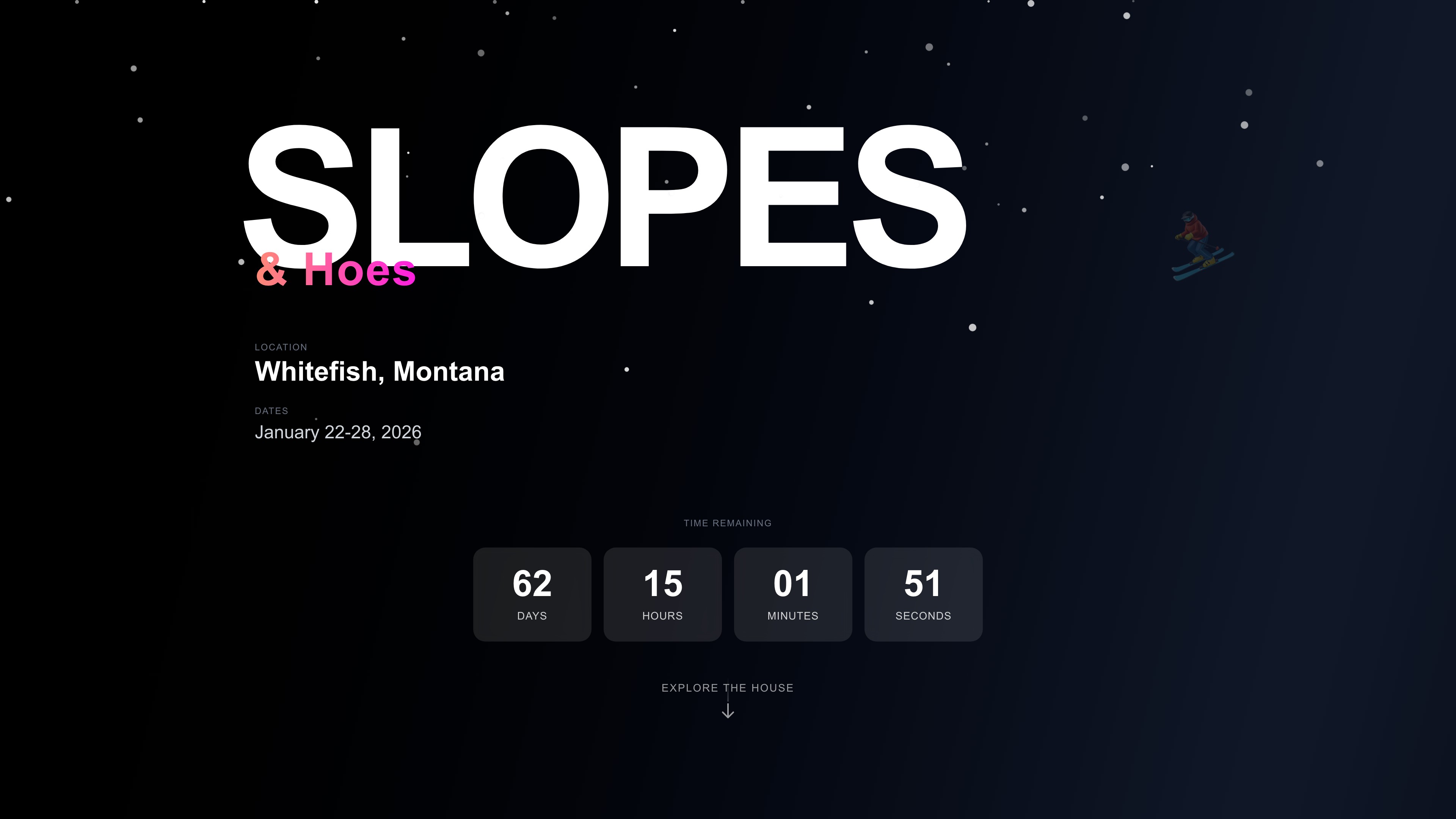 Event coordination website for annual ski trip to Whitefish, Montana featuring live weather, webcams, and countdown timer.